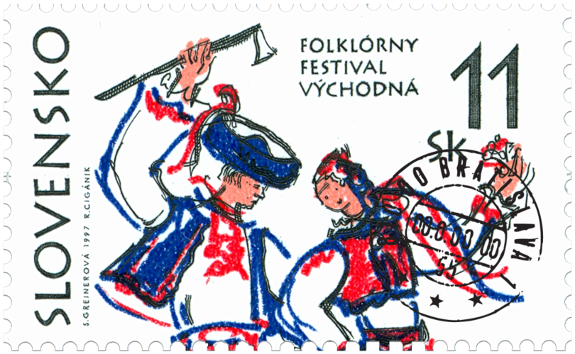 Ministerstvo dopravy, pôšt a telekomunikácií vydalo dňa 12. 6. 1997 príležitostnú poštovú známku "Folklórny festival Východná "v hárčekovej úprave s nominálnou hodnotou 11 Sk. Na hárčeku je zobrazený tancujúci pár v ľudovom kroji, horná polovica zobrazenia tvorí známku, kresba postáv v dolnej časti voľne prechádza na hárček. Autorkou výtvarných návrhov emisie je Sibyla Greinerová, grafická úprava Martin Činovský, rytec Rudolf Cigánik. Viacfarebnú známku o rozmeroch obrazovej časti 23 x 40 mm (na šírku) na hárčeku formátu 66 x 80 mm vytlačila Poštovní tiskárna cenin, a.s., Praha technikou rotačnej oceľotlače v kombinácii s hĺbkotlačou. Folklórny festival Východná - prehliadka ľudovej hudby, spevu...