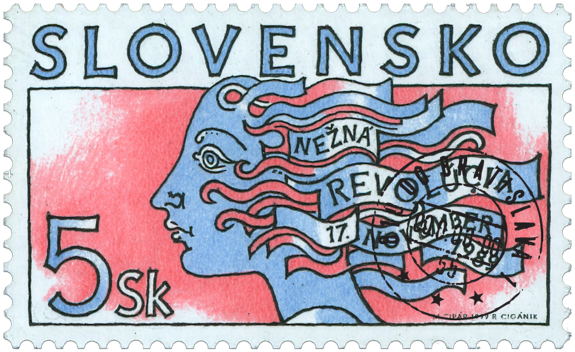 Ministerstvo dopravy, pôšt a telekomunikácií SR vydalo dňa 17. 11. 1999 príležitostnú poštovú známku "Nežná revolúcia 1989" v nominálnej hodnote 5 Sk. Na známke je symbolická kresba - alegória revolúcie v podobe ženskej hlavy z profilu. Autorom výtvarných návrhov emisie je akad. maliar Miroslav Cipár. Rytinu známky vytvoril akad. maliar Rudolf Cigánik. Viacfarebnú známku o rozmeroch obrazovej časti 40 x 23 mm (na šírku) vytlačila Poštovní tiskárna cenin Praha, a.s., technikou rotačnej oceľotlače v kombinácii s hĺbkotlačou na tlačových listoch po 50 známkach. Súčasne bola vydaná obálka prvého dňa vydania vrátane príležitostnej pečiatky s domicilom Bratislava. Na FDC je symbolická kresba...