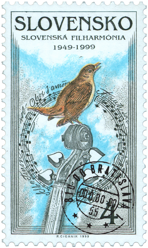 Ministerstvo dopravy, pôšt a telekomunikácií SR vydalo dňa 15.6.1999 príležitostnú poštovú známku " Slovenská filharmónia 1949 - 1999 " s nominálnou hodnotou 4 Sk. Na známke je symbolická kresba ( slávik, ilustračný notový zápis a štylizovaná hlavica huslí). Autorom výtvarných návrhov emisie a súčasne rytcom je akad. maliar Rudolf Cigánik. Viacfarebnú známku o rozmeroch obrazovej časti 23 x 40 mm (na výšku) vytlačila Poštovní tiskárna cenin Praha, a.s., technikou rotačnej oceľotlače v kombinácii s hĺbkotlačou na tlačových listoch po 50 známkach. Súčasne bola vydaná obálka prvého dňa vydania vrátane príležitostnej pečiatky s domicilom Bratislava. Na FDC je symbolická kresba s motívom...