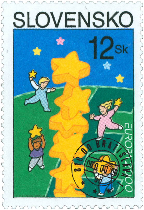 Ministerstvo dopravy, pôšt a telekomunikácií SR vydalo dňa 9. 5. 2000 príležitostnú poštovú známku "Europa 2000" s nominálnou hodnotou 12 Sk. Na známke je jednotne so známkami európskych poštových správ reprodukovaný návrh francúzskeho autora J. P. Cousina ( deti skladajúce vežu z hviezdičiek zo znaku Európskej únie) spolu s logom emisného radu "EUROPA". Grafickú úpravu slovenských textov a rytinu známky vytvoril Martin Činovský. Viacfarebnú známku o rozmeroch obrazovej časti 26 x 40 mm (na výšku) vytlačila Poštovní tiskárna cenin Praha, a.s., technikou oceľotlače z plochých platní (čierna farba) v kombinácii s ofsetom na tlačových listoch po 8 známkach (dva štvorbloky a...