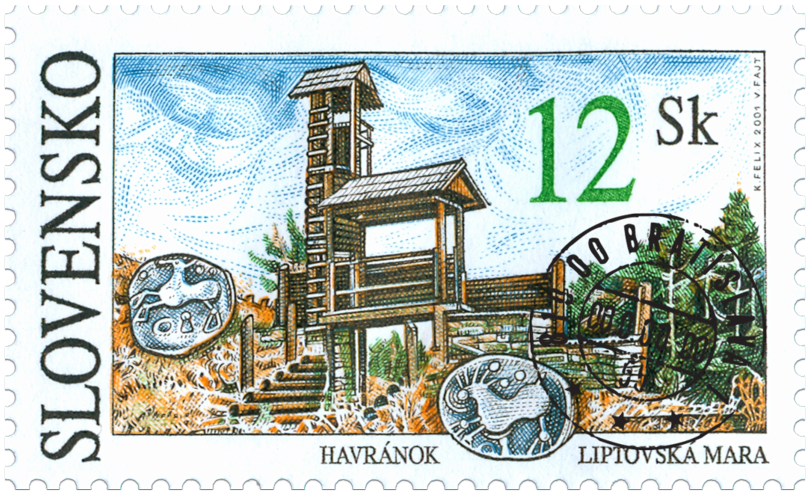 Archeologická lokalita Liptovská Mara - Havránok v zaniknutej obci (zaplavenej pri budovaní vodnej nádrže) v chotári Liptovskej Sielnice, nález pokladu bronzových predmetov z mladšej doby bronzovej, hradisko z mladšej laténskej doby, sídlisko z veľkomoravskej doby. Známka: pohľad na časť archeologickej lokality s rekonštrukciou vnútorného opevnenia s bránou (brána halového typu s pozorovateľňou) - prvé desaťročia prvého storočia n.l. (počiatok doby rímskej), mince keltského typu z Liptovskej Mary. FDC: pohľad na časť archeologickej lokality s rekonštrukciou obytného dvojpriestorového domu (3.-1. stor. pred n.l.), v popredí keramika z expozície, hore zobrazené typy keltských mincí. Pečiatka: kostolík z Liptovskej Mary Na medzipolí tlačového listu...
