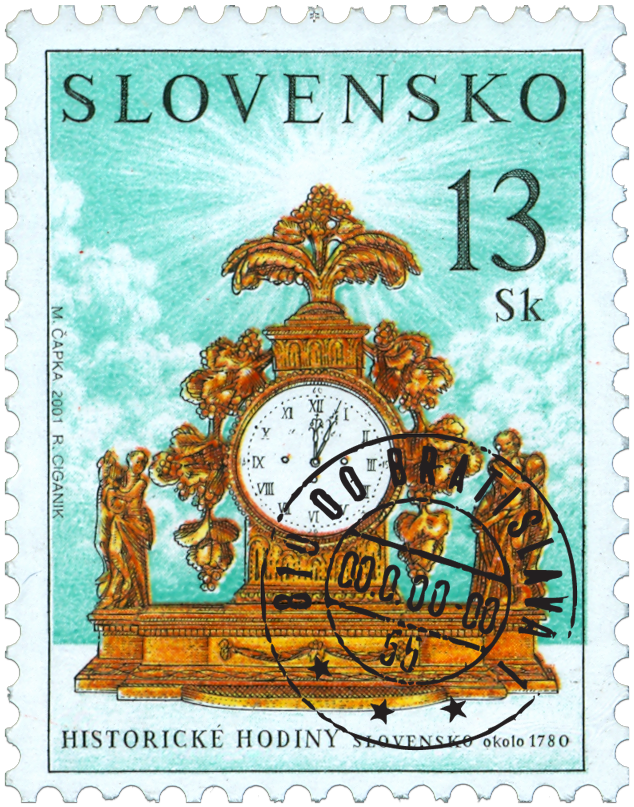 V novokoncipovanom emisnom rade Klenotnica múzeí, ktorý má predstaviť zaujímavé muzeálne exponáty zo slovenských múzeí, predstavujeme na začiatku nového tisícročia vzácne historické hodiny. Exponát zo zbierok Slovenského národného múzea v Bratislave figurálne klasicistické hodiny, zn. nečitateľné, Slovensko, okolo roku 1780, vyrezávané a zlátené drevo, hodinový stroj s kotvovým krokom a odbíjaním, rozmery: výška 65 cm, šírka 72 cm, na zadnej stene záznam o oprave - Hlohovec 1884. Na FDC sú symboly plynutia času: Slnko, Mesiac, hviezdna obloha a voda. Búrkové oblaky symbolizujú dramatické udalosti končiaceho sa tisícročia, Slnko, dúha a kvety zasa začiatok nového. Spolu so slovenskou krajinou ich autor zakomponoval...