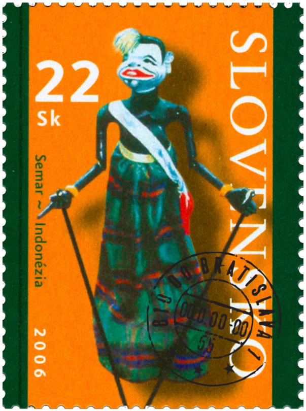 © Slovenská pošta, a. s., 2006 Semar je postavou tradičného divadla Wayang Golek. Bábkové divadlo Wayang má silnú tradíciu nielen na Jáve ale aj v celej Indonézii. Vyjadruje boj medzi dobrom a zlom. Semar alebo Sang Hyang Ismoyo je starší brat najvyššieho boha Guru. Meno Semara je odvodené zo slova sengsem (lákať) a Marsudi (konať, hľadať), čo znamená, že podľa svojho mena Semar nás pobáda hľadať alebo robiť dobré veci. Jeho biela tvár symbolizuje učiteľa s milým a čestným výzorom, ktorého žiaci môžu šťastne nasledovať v jeho ponaučeniach. Naopak, pri učiteľovi s čiernou tvárou trpia, pretože sa ho boja. Jeho jeden...