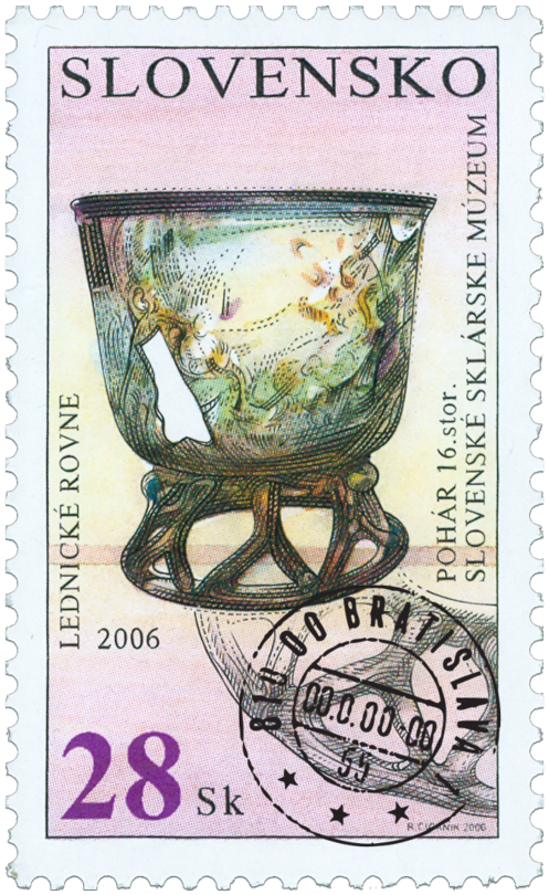 © Slovenská pošta, a.s., 2006 Sklársku výrobu na Slovensku v renesančnom období výrazne ovplyvňovali veľké sklárske centrá. Po príchode neapolských Anjouovcov na uhorský trón /1301-1386/ to boli hlavne benátske dielne. Prví benátski sklári sa k nám prisťahovali pravdepodobne až začiatkom 15. storočia. O ich prítomnosti na východnom Slovensku svedčí obec Venecia spomínaná v roku 1410. Talianska renesancia sa udomácnila v prostredí kráľovského dvora, šľachty a bohatých mešťanov predovšetkým v období vlády Mateja Korvína / 1458-1490/. Je známe, že v 16. a 17. storočí sa bežne objednávali a dovážali poháre a čaše priamo z Benátok. Okrem charakteristických pohárov na profilovaných stopkách s...