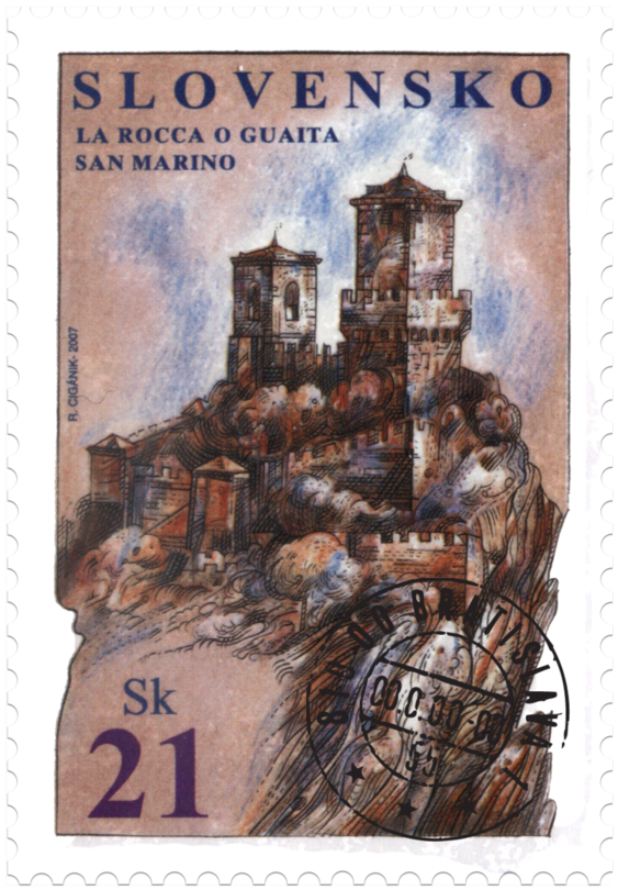 © Slovenská pošta, a . s., 2007 Po prejdení Contrada dei Magazzeni alebo Contrada dei Fossi rýchlo dosiahneme nadmorskú výšku 751 m, odkiaľ máme neobmedzený výhľad do okolia. Opevnené jadro Prvej veže s päťuholníkovým základom spočíva priamo na skale a je považované za jednu z najstarších talianskych veží (datovanú do 11. storočia). Pozostáva z centrálnej bašty a dvoch oblúkov, pričom vonkajšia stena jedného z oblúkov dekorovaná cimburím je zvyškom pôvodného obranného múru. Naproti vstupu, na malom námestí, môžeme obdivovať sochu B. Marabiniho a delá, ktoré venovalo Švajčiarsko Republike San Marino v roku 1989. Kedysi bol na vchode umiestnený erb republiky, pochádzajúci...