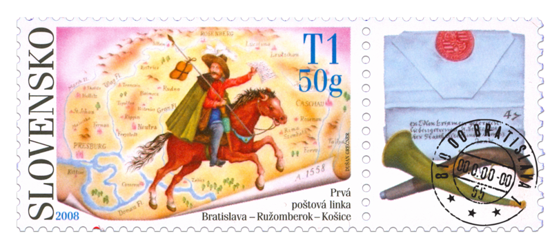 Označenie T1 50g zodpovedá tarife pre list 1. triedy do 50 g v tuzemskom styku. © Slovenská pošta, a. s., 2008 Pod vplyvom hroziaceho tureckého nebezpečenstva, ešte pred okupáciou Uhorska, vydal panovnícky dvor nariadenie na zriaďovanie strategických poštových liniek. Poštovú linku Viedeň – Bratislava zabezpečil na príkaz dvora v r. 1530 Matej Taxis. V tomto čase poštmajstrom pre Bratislavu bol Peter Paár, ktorý sa stal neskôr hlavným poštmajstrom pre väčšiu časť Slovenska. Medzitým bolo uložené, aby linku Viedeň – Bratislava z naliehavých strategických dôvodov predlžili smerom na východ k Sedmohradsku. Táto linka prechádzala Považím, ďalej cez úpätie Karpát, Levoču, Prešov do...