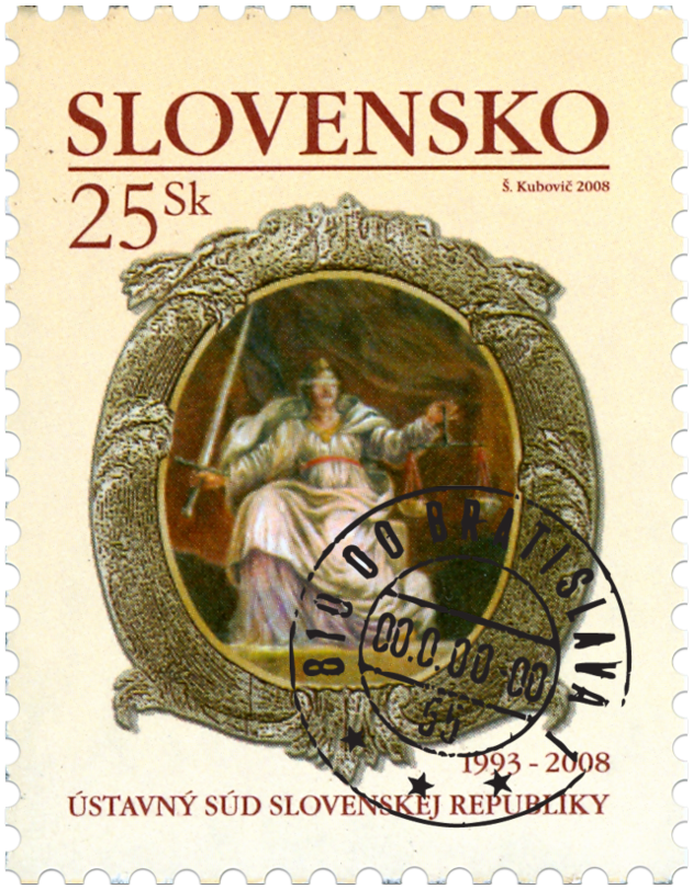 © Slovenská pošta, a . s., 2008 Rok 2008 prináša vo svojej vnútornej symbolike ďalšie z ucelených výročí moderných dejín Slovenskej republiky . Patrí sem aj 15. výročie vzniku Ústavného súdu SR, ktorý v súčasnosti sídli v historizujúcej budove bývalých Jiskrových kasární v Košiciach. Inštitúciu Ústavného súdu, ako garanta ochrany ústavnosti, zakotvila Ústava Slovenskej republiky z 1. septembra 1992. Právne podmienky pre jeho faktickú organizáciu umožnil zákon NR SR č.38/1993 a svoju činnosť Ústavný súd začal 17. marca 1993. Dnes je jedným z ťažiskových ústavných pilierov slovenskej štátnosti, právneho a demokratického statusu Slovenskej republiky . Na poštovej známke je stvárnený motív...