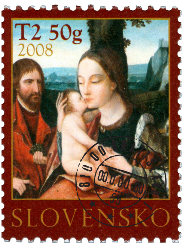 Označenie T2 50 g zodpovedá tarife pre list 2. triedy do 50 g v tuzemskom styku. © Slovenská pošta, a . s., 2008 V čase Božieho hodu vianočného prezentuje Slovenská pošta, a.s. na poštovej známke zaujímavú pamiatku flámskeho maliarstva pol. 16. storočia, obraz s motívom Svätej Rodiny zo zbierky SNG. Pamiatky nizozemského a flámskeho maliarstva 16. storočia, nachádzajúce sa v súčasnosti v slovenských múzeách a galériách, tvorili pôvodne súčasť zbierok miestnej šľachty a bohatých podnikateľov, nakoľko holandské maliarstvo bolo v minulosti veľmi oceňované najmä sofistikovanými zberateľmi z radov miestnych priemyselníkov. Tak je tomu i v prípade obrazu Sv. Rodiny od Antverpského...