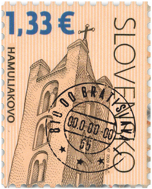 © Slovenská pošta, a . s., 2009 Oblasť juhozápadného Slovenska má pomerne bohatý fond románskych architektonických pamiatok. Avšak len málo stavieb si zachovalo ucelenú podobu. Jednou z nich je tehlový, jednoloďový Kostol sv. Kríža v Hamuliakove. Postavili ho okolo polovice 13. storočia, v čase, keď do románskeho architektonického tvaroslovia prenikali už aj gotické inovácie. V Hamuliakove je takou inováciou polygonálny tvar presbytéria, napájajúceho sa na pozdĺžnu loď kostola. Inak sa u tejto stavby stretávame s typicky románskymi formami, ako sú úzke, polkruhovo ukončené okná s hlboko zošikmenými osteniami, zuborez a oblúčkový vlys, tvorený pretínajúcimi sa polkruhmi, na exteriérovej strane presbytéria, združené...