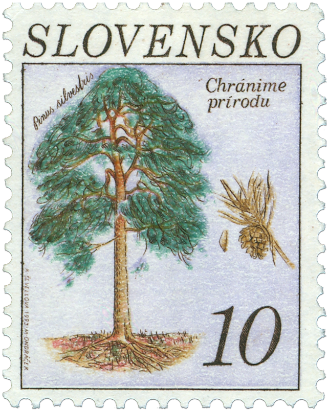 Ministerstvo dopravy, spojov a verejných prác SR vydalo dňa 14.5.1993 tri príležitostné známky v sérii "Ochrana prírody": 3 Sk - Dub letný (Quercus robur) - farba zelenomodrá, žltozelená, šedohnedá, hnedá a čierna 4 Sk - Hrab obyčajný (Carpinus betulus) - farba okrová, hnedá, zelená, šedá a čierna 10 Sk - Borovica sosna (Pinus silvestris) - farba modrá, hnedá, zelená, červená a čierna Autorom výtvarných návrhov emisie je Katarína Ševellová a autorom rytiny je Miloš Ondráček. Známky rozmerov obrazovaj časti 23x30 mm na výšku vytlačila Poštová tlačiareň cenín a.s. v Prahe rotačnou oceľotlačou v kombinácii s hĺbkotlačou na tlačových listoch po 50...