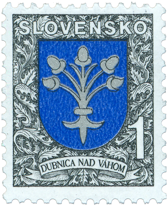 Ministerstvo dopravy, spojov a verejných prác Slovenskej republiky vydalo dňa 8.7.1993 výplatnú poštovú známku "Dubnica nad Váhom" s nominálnou hodnotou 1 Sk. Autorom výtvarného návrhu známky s námetom erbu mesta Dubnica nad Váhom, ryteckej rozkresby a rytiny je akademický maliar Martin Činovský. Známku veľkosti 19x23 mm na výšku vytlačila Poštová tlačiareň cenín Praha a.s. rotačnou oceľotlačou v kombinácii s hĺbkotlačou na tlačových listoch po 100 kusoch. Známka platí v tuzemskom a medzinárodnom styku od 8.7.1993 až do odvolania. Prvá písomná zmienka o Dubnici je z roku 1193, kde je uvedené, že majiteľmi sú bratia Vratislav a Piskin a majetok im daroval...