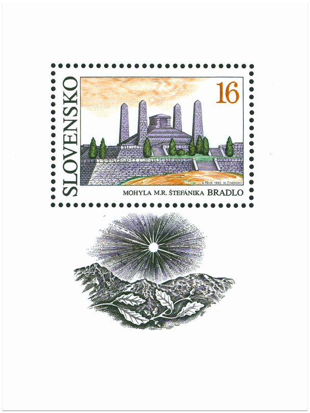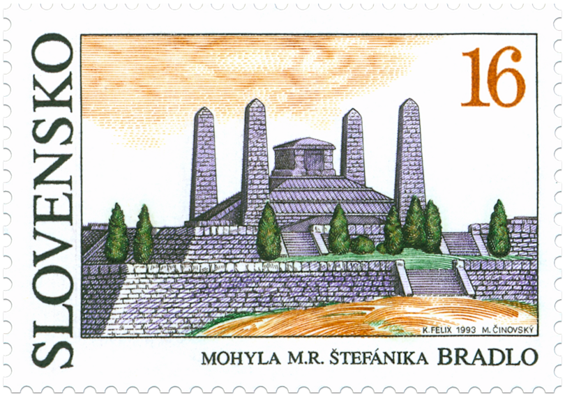 Ministerstvo dopravy, spojov a verejných prác Slovenskej republiky vydalo dňa 17. 12. 1993 príležitostnú poštovú známku "Mohyla M. R. Štefánika Bradlo" v nominálnej hodnote 16 Sk. Viacfarebná známka rozmerov obrazovej časti 40 x 26 mm je vytlačená na poštovom hárčeku rozmerov 70 x 90 mm. Na známke je stavba mohyly realizovaná podľa projektu architekta Dušana Jurkoviča. V dolnej časti hárčeka je zobrazený pohľad na krajinu. Autorom výtvarných návrhov emisie je akad. maliar Karol Felix. Rytcom známky je akad. maliar Martin Činovský. Sprievodný motív na hárčeku vyryl František Horniak. Hárček vytlačila PTC, a. s. Praha oceľotlačou z plochých platní. Známka platí v...