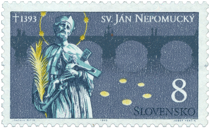 Ministerstvo dopravy, spojov a verejných prác vydalo dňa 11.3.1993 spoločne s Českou republikou a Spolkovou republikou Nemecko príležitostnú poštovú známku " Svätý Ján Nepomucký". Známka s rovnakým kresbovým motívom vznikla na podklade výtvarného návrhu nemeckého grafika Joachima Riessa. Spoločné vydanie sa bude líšiť iba hodnotou (ČR 8 Kč, SR 8, SRN 100), jazykovými mutáciami textu a technikou tlače. Známka obsahuje vo výtvarnej kompozícii s pohľadom na Karlov most v Prahe detail sochy sv. Jána Nepomuckého vytvorené na základe kresby J.B. Matheya a škicu viedeňského sochára M. Rauchmullera podľa dreveného modelu J. Brokofa, odliata bola J.W. Heroldtom z bronzu v Norimberku v...
