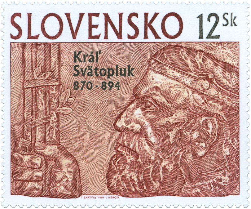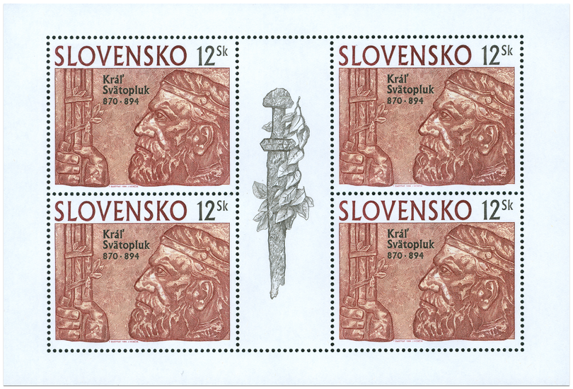Ministerstvo dopravy, spojov a verejných prác Slovenskej republiky vydalo dňa 20.7.1994 príležitostnú poštovú známku "Kráľ Svätopluk - 1100 výročie úmrtia", v nominálnej hodnote 12 Sk. Viacfarebná známka, rozmerov obrazovej časti 40 x 50 mm je venovaná kráľovi Svätoplukovi k 1100. výročiu jeho úmrtia. Na známke je sochárske stvárnenie idealizovaného portrétu najvýznamnejšieho člena dynastie Mojmírovcov so symbolom Svätoplukových " prútov svornosti". V hornej časti známky okrem označenia SLOVENSKO a 12 Sk je nápis "Kráľ Svätopluk 870-894 " . Autorom výtvarných návrhov emisie je akad.sochár Tibor Bartfay. Rytcom známky je J.Herčík. Známku v 100 000 tlačových listoch po 4 ks vytlačila Poštová tlačiare...
