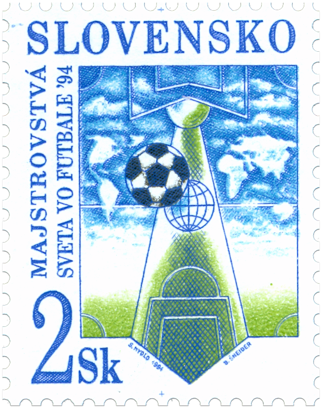 Ministerstvo dopravy, spojov a verejných prác vydalo dňa 10. 6. 1994 príležitostnú poštovú známku "Majstrovstvá sveta vo futbale '94" v nominálnej hodnote 2 Sk. Prevažne modro-zelená kresba známky s motívmi futbalovej lopty, zemegule a ihriska, ktoré sa mení v mapu sveta vyobrazenú na pánskej košeli s viazankou, doplnená vertikálne umiestneným textom názvu podujatia, je dielom akad. maliara Svetozára Mydla. Autorom rytiny je B. Šneider. Viacfarebnú známku rozmerov obrazovej časti 23 x 30 mm na výšku vytlačila Poštovní tiskárna cenin, a.s., Praha rotačnou oceľotlačou v kombinácii s hĺbkotlačou na tlačových listoch po 50 ks v náklade 7 000 000 ks. Majstrovstvá sveta...