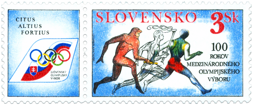 Ministerstvo dopravy, spojov a verejných prác vydalo dňa 23. 6. 1994 príležitostnú poštovú známku "Olympijské hnutie" v nominálnej hodnote 3 Sk. Viacfarebná známka rozmerov 23 x 40 mm, na ktorej je symbolicky vyjadrené odovzdávanie štafety olympijských ideálov od antiky až po modernú dobu, s nápisom 100 rokov Medzinárodného olympijského výboru, je doplnená kupónom rozmerov 23 x 19 mm. Na kupóne je znak Slovenského olympijského výboru a olympijské heslo. Autorom výtvarného návrhu známky a kupónu je akad.maliar Ivan Schurmann. Autorom rytiny známky je akademický maliar Martin Činovský. Rytinu kupónu vytvoril František Horniak. Známku a kupón vytlačila Poštovní tiskárna cenin, a.s., Praha rotačnou...