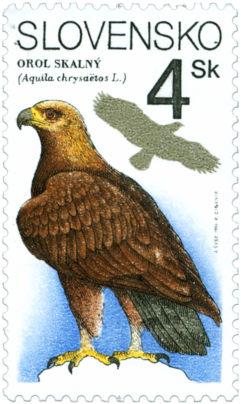 Ministerstvo dopravy, spojov a verejných prác vydalo dňa 4. 7. 1994 tri príležitostné poštové známky v sérii "Ochrana prírody": 4 Sk - orol skalný (Aquila chrysaetus L.) 5 Sk - sokol sťahovavý (Falco peregrinus Tunst.) 7 Sk - výr skalný (Bubo bubo L.) Autorom výtvarných návrhov emisie je akad. maliar Ján Švec, autorom rytín je akad. maliar Rudolf Cigánik. Viacfarebné známky, rozmerov obrazovej časti 23 x 40 mm, na výšku, vytlačila Poštovní tiskárna cenin, a. s., Praha rotačnou oceľotlačou v kombinácii s hĺbkotlačou na tlačových listoch po 50 ks v náklade po 5 000 000 ks. Dravec orol skalný dnes sa...