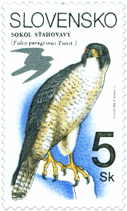 Ministerstvo dopravy, spojov a verejných prác vydalo dňa 4. 7. 1994 tri príležitostné poštové známky v sérii "Ochrana prírody": 4 Sk - orol skalný (Aquila chrysaetus L.) 5 Sk - sokol sťahovavý (Falco peregrinus Tunst.) 7 Sk - výr skalný (Bubo bubo L.) Autorom výtvarných návrhov emisie je akad. maliar Ján Švec, autorom rytín je akad. maliar Rudolf Cigánik. Viacfarebné známky, rozmerov obrazovej časti 23 x 40 mm, na výšku, vytlačila Poštovní tiskárna cenin, a. s., Praha rotačnou oceľotlačou v kombinácii s hĺbkotlačou na tlačových listoch po 50 ks v náklade po 5 000 000 ks. Sokol sťahovavý je jeden z...