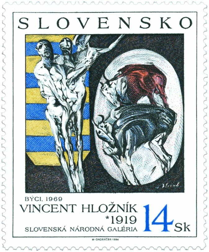 Ministerstvo dopravy, spojov a verejných prác vydalo dňa 15.12.1994 príležitostnú poštovú známku "Vincent Hložník: Býci", zo série Umenie, v nominálnej hodnote 14 Sk. Na známke pod reprodukciou diela okrem uvedenia nominálnej hodnoty sú texty: Býci, 1969, Vincent Hložník, 1919, Slovenská národná galéria. Autorom grafickej úpravy je akad. maliar Martin Činovský. Autorom rytín emisie je M. Ondráček. Viacfarebnú známku rozmerov obrazovej časti 40 x 50 mm,na výšku, vytlačila PTC, a.s., Praha 5-farebnou oceľotlačou z plochých platní na tlačových listoch po 4 ks. Celkovo bolo vytlačených 400 000 ks. Vincent Hložník - národný umelec, vysokoškolský profesor, maliar, grafik, ilustrátor, pedagóg. Narodil sa 22...