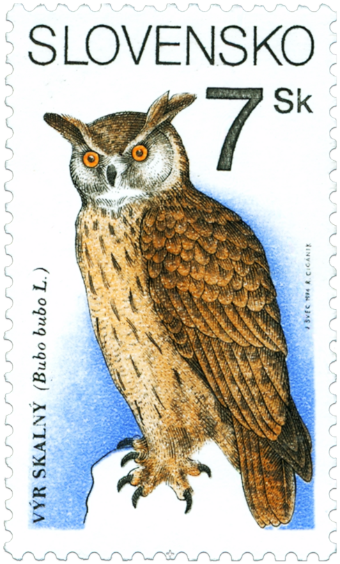 Ministerstvo dopravy, spojov a verejných prác vydalo dňa 4. 7. 1994 tri príležitostné poštové známky v sérii "Ochrana prírody": 4 Sk - orol skalný (Aquila chrysaetus L.) 5 Sk - sokol sťahovavý (Falco peregrinus Tunst.) 7 Sk - výr skalný (Bubo bubo L.) Autorom výtvarných návrhov emisie je akad. maliar Ján Švec, autorom rytín je akad. maliar Rudolf Cigánik. Viacfarebné známky, rozmerov obrazovej časti 23 x 40 mm, na výšku, vytlačila Poštovní tiskárna cenin, a. s., Praha rotačnou oceľotlačou v kombinácii s hĺbkotlačou na tlačových listoch po 50 ks v náklade po 5 000 000 ks. Výr skalný sa vyskytuje po...