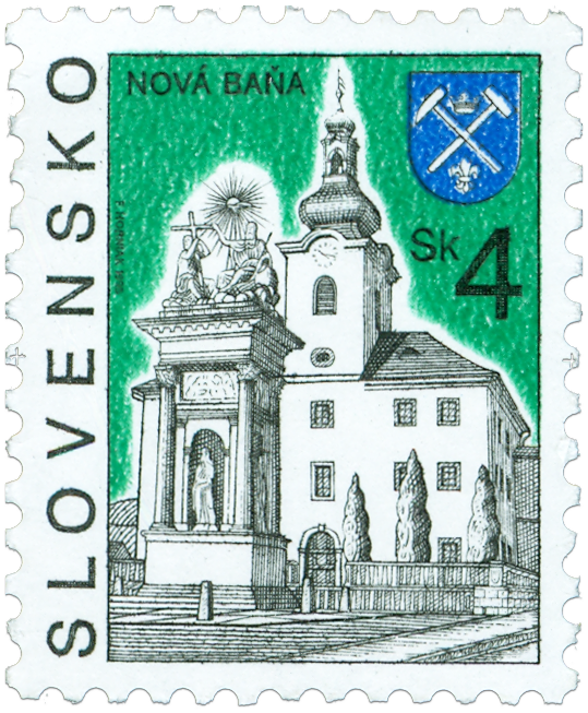 Ministerstvo dopravy, pôšt a telekomunikácií vydalo dňa 15. 6. 1995 výplatnú poštovú známku "Nová Baňa" v nominálnej hodnote 4 Sk. Nová Baňa - starobylé banské kráľovské mesto. Najstaršia písomná zmienka o osade Seunich a súčasne o baníctve je z roku 1337. K jej rozvoju prispeli bohaté náleziská zlatej rudy , takže už v polovici 14. str. sa vyvinula ako aglomerácia mestského typu. Najmä zničenie mesta Turkami v roku 1664, stavovské povstania a problémy spodnej vody pôsobili na rozvoj mesta retardačne. Zatopené šachty mal zachrániť "atmosferický ohňový stroj", vybudovaný v roku 1722 po prvý raz na európskom kontinente práve v Novej Bani...