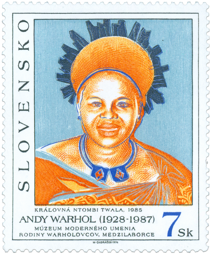 Ministerstvo dopravy, pôšt a telekomunikácií vydalo dňa 13. 11.1996 príležitostnú poštovú známku "Andy Warhol: Kráľovná NTOMBI TWALA" zo série Umenie o nominálnej hodnote 7 Sk. Na známke pod vyobrazením diela sú okrem nominálnej hodnoty texty: " Andy Warhol (1928-1987), Kráľovná NTOMBI TWALA, 1985, Múzeum moderného umenia rodiny Warholovcov, Medzilaborce". Autorom grafickej úpravy emisie je akad. maliar Martin Činovský, autorom rytín emisie je Miloš Ondráček. Viacfarebnú známku o rozmeroch obrazovej časti 40 x 50 mm (na výšku) vytlačila Poštovní tiskárna cenin, a.s., Praha technikou 5-farebnej oceľotlače z plochých platní na tlačových listoch o 4 známkach a 2 nepotlačených kupónoch Prístup k výtvarnej...