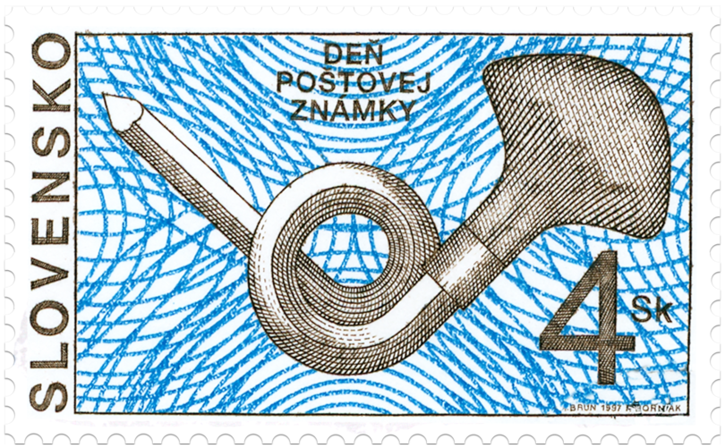 Ministerstvo dopravy, pôšt a telekomunikácií SR vydalo dňa 18. 12. 1997 príležitostnú poštovú známku " Deň poštovej známky " s nominálnou hodnotou 4.Sk. Na známka je parafráza loga Slovenskej pošty, š.p. v podobe rydla skrúteného do tvaru poštovej trúbky zobrazeného na podklade siete rytých línií. Na kupóne je zobrazené oko - motív rozložený autotypickým rastrom . Autorom výtvarných návrhov emisie je Robert Brun. Rytcom je František Horniak . Známku hnedo-modrej farebnosti rozmerov obrazovej časti 40 x.23 mm (na šírku) a kupón rozmerov 19 x 23 mm (na výšku) vytlačila Poštovní tiskárna cenin, a.s., Praha technikou rotačnej oceľotlače v kombinácii s hĺbkotlačou...