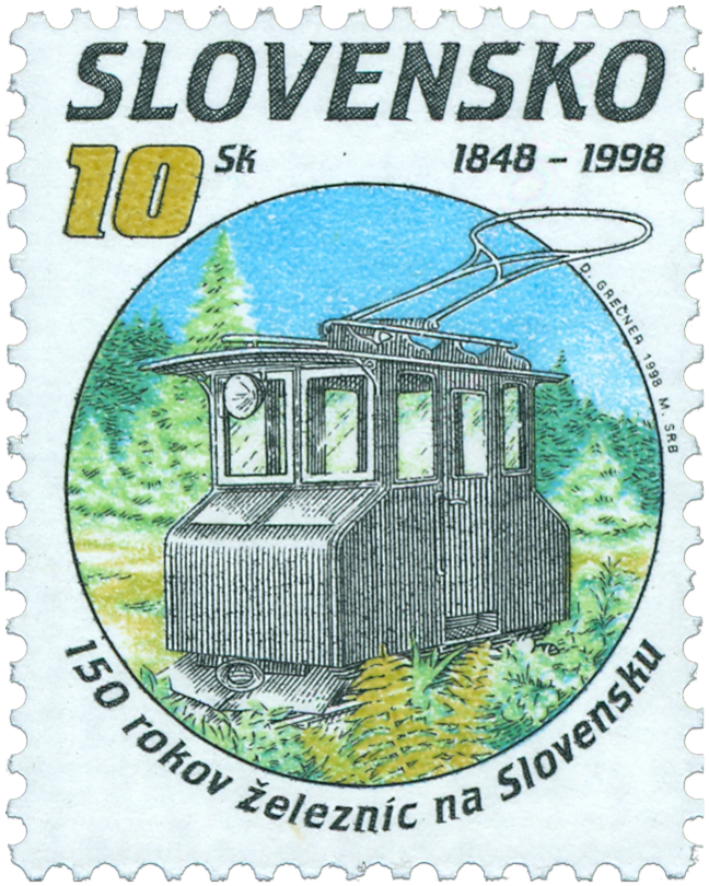 Ministerstvo dopravy, pôšt a telekomunikácií SR vydalo dňa 20. 8. 1998 tri príležitostné poštové známky série "150 rokov železníc na Slovensku" z emisného radu Technické pamiatky: parný rušeň - 4 Sk elektrický rušeň - 10 Sk motorový voz - 15 Sk Autorom výtvarných návrhov emisie je Dušan Grečner, rytcom je Martin Srb. Viacfarebné známky o rozmeroch obrazovej časti 23 x 30 mm (na výšku) vytlačila Poštovní tiskárna cenin Praha, a.s., technikou rotačnej oceľotlače v kombinácii s hĺbkotlačou na tlačových listoch po 50 známkach. Súčasne boli vydané 3 obálky prvého dňa vydania vrátane príležitostnej pečiatky s domicilom Bratislava. Na FDC známky elektrického...
