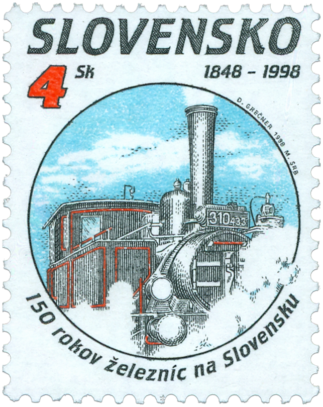Ministerstvo dopravy, pôšt a telekomunikácií SR vydalo dňa 20. 8. 1998 tri príležitostné poštové známky série "150 rokov železníc na Slovensku" z emisného radu Technické pamiatky: parný rušeň - 4 Sk elektrický rušeň - 10 Sk motorový voz - 15 Sk Autorom výtvarných návrhov emisie je Dušan Grečner, rytcom je Martin Srb. Viacfarebné známky o rozmeroch obrazovej časti 23 x 30 mm (na výšku) vytlačila Poštovní tiskárna cenin Praha, a.s., technikou rotačnej oceľotlače v kombinácii s hĺbkotlačou na tlačových listoch po 50 známkach. Súčasne boli vydané 3 obálky prvého dňa vydania vrátane príležitostnej pečiatky s domicilom Bratislava. Na FDC známky parného...
