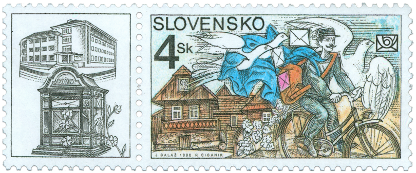 Ministerstvo dopravy, pôšt a telekomunikácií SR vydalo dňa 18. 12. 1998 príležitostnú poštovú známku " História pošty " z emisného radu Deň poštovej známky s nominálnou hodnotou 4 Sk a s pripojeným kupónom. Na známke je zobrazený poštový doručovateľ na bicykli na pozadí typickej slovenskej dedinskej architektúry (drevenice) a symbolov poštovníctva doplnených o logo Slovenskej pošty, š.p. Na kupóne je historická poštová schránka a budova pošty v Banskej Bystrici. Autorom výtvarných návrhov emisie je akad. maliar Jozef Baláž. Rytiny vytvoril akad. maliar Rudolf Cigánik. Viacfarebnú známku o rozmeroch obrazovej časti 40 x 23 mm (na šírku) a jednofarebný kupón (hnedočierna farba...