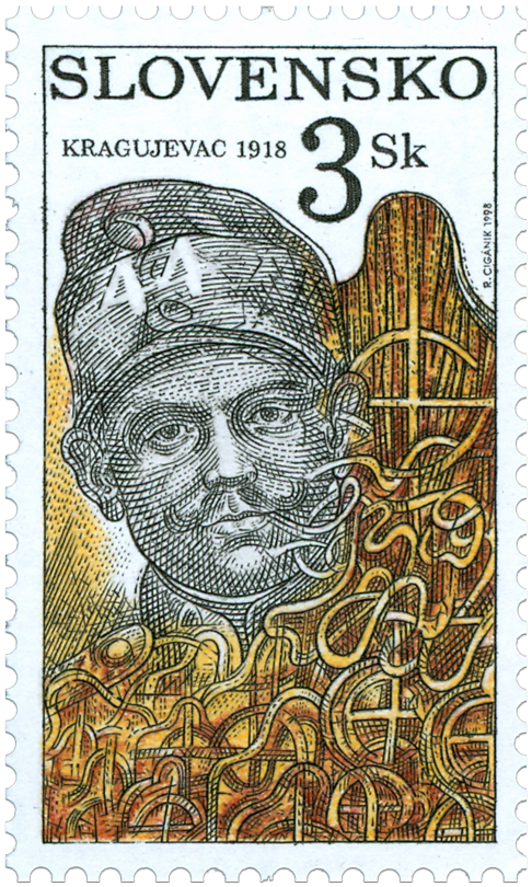 Ministerstvo dopravy, pôšt a telekomunikácií SR vydalo dňa 1. 6. 1998 príležitostnú poštovú známku "Kragujevac 1918" s nominálnou hodnotou 3 Sk. Známka s portrétom vodcu vzbury Viktora Kolibíka z trenčianskeho 71. pluku rakúsko-uhorskej armády Autorom výtvarných návrhov emisie a súčasne aj rytcom je Rudolf Cigánik . Viacfarebnú známku o rozmeroch obrazovej časti 23 x 40 mm (na výšku, šírku) vytlačila Poštovní tiskárna cenin Praha, a.s., technikou rotačnej oceľotlače v kombinácii s hĺbkotlačou na tlačových listoch po 50 známkach . Súčasne bola vydaná obálka prvého dňa vydania vrátane príležitostnej pečiatky s domicilom Trenčín. FDC vytlačila uvedená tlačiareň oceľotlačou z plochých platní v...