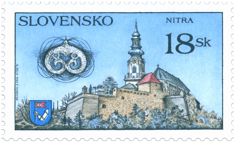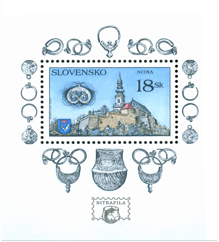 Ministerstvo dopravy, pôšt a telekomunikácií SR vydalo dňa 3. 3. 1998 tri príležitostné poštové známky série "Krásy našej vlasti" s námetom hradov: Budatín - 6 Sk Krásna Hôrka - 11 Sk Nitra - 18 Sk Známka Nitra vyšla v hárčekovej úprave, na hárčeku rozmerov 75 x 82 mm sú okrem známky vyobrazené archeologické pamiatky z nálezísk Nitry. Okrem hradného komplexu a erbu Nitry, nádoba kultúry s volutovou keramikou (neolit), prstene, náušnice, gombíky z veľkomoravského a poveľkomoravského obdobia z nálezísk Nitry, logo výstavy Nitrafila. Autorom známky a hárčeka je Karol Felix, rytcom je František Horniak. Hárček technikou oceľotlač z plochých platní v...