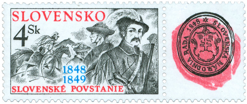 Ministerstvo dopravy, pôšt a telekomunikácií SR vydalo dňa 1. 6. 1998 príležitostnú poštovú známku "Slovenské povstanie 1848-49" s nominálnou hodnotou 4 Sk a s kupónom 150. výročia Slovenskej národnej rady. Na známke sú zobrazení slovenskí povstalci, na kupóne je historická pečať Slovenskej národnej rady. Autorom výtvarných návrhov emisie je Ivan Schurmann, rytcom je Miloš Ondráček. Viacfarebnú známku o rozmeroch obrazovej časti 23 x 40 mm (na šírku) a kupón rozmerov 19 x 23 mm ( na výšku) vytlačila Poštovní tiskárna cenin Praha, a.s., technikou rotačnej oceľotlače v kombinácii s hĺbkotlačou na tlačových listoch po 30 známkach a 40 kupónoch. Súčasne bola...