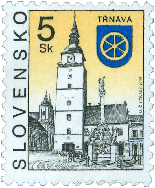 Ministerstvo dopravy, pôšt a telekomunikácií SR vydalo dňa 12. 9. 1998 bežnú výplatnú poštovú známku "Trnava" s nominálnou hodnotou 5 Sk. Na známke sú dominanty historického jadra mesta - mestská veža a súsošie Najsvätejšej trojice. Doplnená je erbom mesta. Autorom výtvarných návrhov emisie a súčasne aj rytcom známky je Martin Činovský. Známku čierno-žlto-modrej farebnosti o rozmeroch obrazovej časti 19 x 23 mm (na výšku) vytlačila Poštovní tiskárna cenin Praha, a.s., technikou rotačnej oceľotlače v kombinácii s hĺbkotlačou na tlačových listoch po 100 ks známok . Súčasne bola vydaná obálka prvého dňa vydania vrátane príležitostnej pečiatky s domicilom Trnava. Na FDC je...