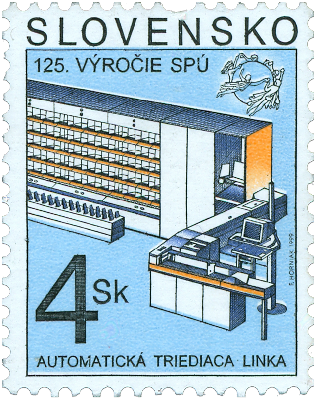 Ministerstvo dopravy, pôšt a telekomunikácü SR vydalo dňa 12. 3.1999 príležitostnú poštovú známku k 125. výročiu Svetovej poštovej únie zobrazujúcu automatickú triediacu linku s nominálnou hodnotou 4 Sk. Známku dopĺňa logo SPÚ. Autorom výtvarných návrhov emisie a rytcom je František Horniak. Viacfarebnú známku o rozmeroch obrazovej časti 23 x 30 mm (na výšku) vytlačila Poštovní tiskárna cenin Praha, a.s., technikou rotačnej oceľotlače v kombinácii s hĺbkotlačou na tlačových listoch po 50 známkach. Súčasne bola vydaná obálka prvého dňa vydania vrátane pńležitostnej pečiatky s domicilom Bratislava. Na FDC je symbolická kresba (zemeguľa, pás listov a logo Slovenskej pošty, š.p. FDC vytlačila uvedená...