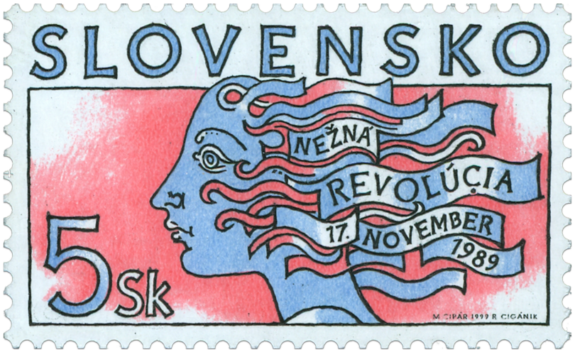 Ministerstvo dopravy, pôšt a telekomunikácií SR vydalo dňa 17. 11. 1999 príležitostnú poštovú známku "Nežná revolúcia 1989" v nominálnej hodnote 5 Sk. Na známke je symbolická kresba - alegória revolúcie v podobe ženskej hlavy z profilu. Autorom výtvarných návrhov emisie je akad. maliar Miroslav Cipár. Rytinu známky vytvoril akad. maliar Rudolf Cigánik. Viacfarebnú známku o rozmeroch obrazovej časti 40 x 23 mm (na šírku) vytlačila Poštovní tiskárna cenin Praha, a.s., technikou rotačnej oceľotlače v kombinácii s hĺbkotlačou na tlačových listoch po 50 známkach. Súčasne bola vydaná obálka prvého dňa vydania vrátane príležitostnej pečiatky s domicilom Bratislava. Na FDC je symbolická kresba...