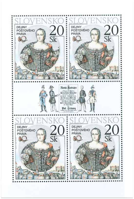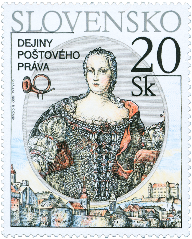 Ministerstvo dopravy, pôšt a telekomunikácií SR vydalo dňa 18. 12. 2000 príležitostnú poštovú známku "Dejiny poštového práva" s nominálnou hodnotou 20 Sk. Na známke je portrét Márie Terézie v korunovačnom odeve (výrez olejomaľby Daniela Schmidelyho), výrez z veduty Bratislavy, poštová trúbka a nápis Dejiny poštového práva. Na pripojenom kupóne je titulná strana poštového nariadenia Márie Terézie z roku 1748 a postavy poštárov v dobových uniformách. Autorom výtvarných návrhov emisie je akad. maliar Prof. Dušan Kállay. Rytiny emisie vytvoril akad. maliar Rudolf Cigánik. Viacfarebnú známku o rozmeroch obrazovej časti 40 x 50 mm (na výšku) a kupón s obrazovou časťou rozmerov 48...