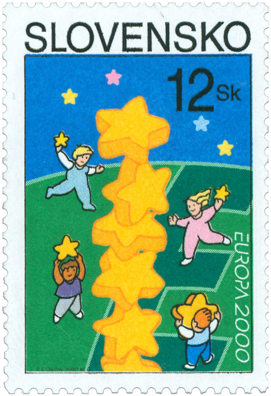 Ministerstvo dopravy, pôšt a telekomunikácií SR vydalo dňa 9. 5. 2000 príležitostnú poštovú známku "Europa 2000" s nominálnou hodnotou 12 Sk. Na známke je jednotne so známkami európskych poštových správ reprodukovaný návrh francúzskeho autora J. P. Cousina ( deti skladajúce vežu z hviezdičiek zo znaku Európskej únie) spolu s logom emisného radu "EUROPA". Grafickú úpravu slovenských textov a rytinu známky vytvoril Martin Činovský. Viacfarebnú známku o rozmeroch obrazovej časti 26 x 40 mm (na výšku) vytlačila Poštovní tiskárna cenin Praha, a.s., technikou oceľotlače z plochých platní (čierna farba) v kombinácii s ofsetom na tlačových listoch po 8 známkach (dva štvorbloky a...