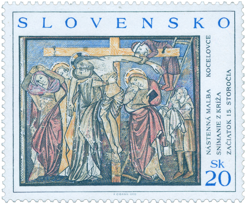 Ministerstvo dopravy, pôšt a telekomunikácií SR vydalo dňa 17. 10. 2000 príležitostnú poštovú známku série Umenie reprodukujúcu stredovekú nástennú maľbu "Snímanie z kríža" (začiatok 15. str.) z evanjelického kostola v Koceľovciach (okres Rožňava) s nominálnou hodnotou 20 Sk. Ryteckú transkripciu diela vytvoril Rudolf Cigánik. Viacfarebnú známku o rozmeroch obrazovej časti 40 x 50 mm (na výšku) vytlačila Poštovní tiskárna cenin Praha, a.s., technikou 5-farebnej oceľotlače z plochých platní na tlačových listoch so 4 známkami a nepotlačeným kupónom. Súčasne bola vydaná obálka prvého dňa vydania vrátane príležitostnej pečiatky s domicilom Rožňava. Na FDC je výrez z nástennej maľby z kostola v Koceľovciach...