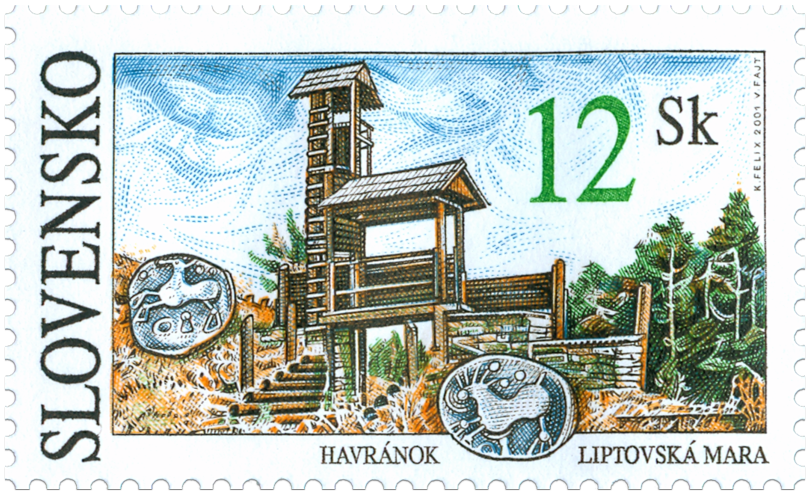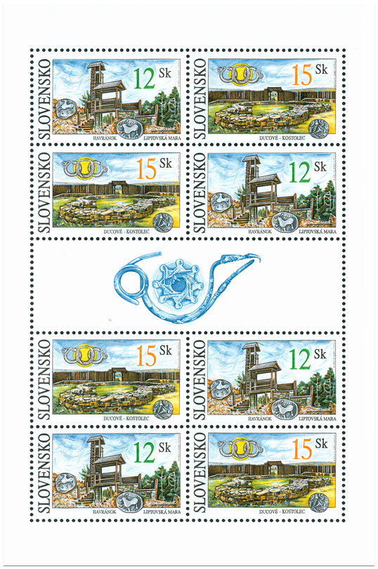 Archeologická lokalita Liptovská Mara - Havránok v zaniknutej obci (zaplavenej pri budovaní vodnej nádrže) v chotári Liptovskej Sielnice, nález pokladu bronzových predmetov z mladšej doby bronzovej, hradisko z mladšej laténskej doby, sídlisko z veľkomoravskej doby. Známka: pohľad na časť archeologickej lokality s rekonštrukciou vnútorného opevnenia s bránou (brána halového typu s pozorovateľňou) - prvé desaťročia prvého storočia n.l. (počiatok doby rímskej), mince keltského typu z Liptovskej Mary. FDC: pohľad na časť archeologickej lokality s rekonštrukciou obytného dvojpriestorového domu (3.-1. stor. pred n.l.), v popredí keramika z expozície, hore zobrazené typy keltských mincí. Pečiatka: kostolík z Liptovskej Mary Na medzipolí tlačového listu...