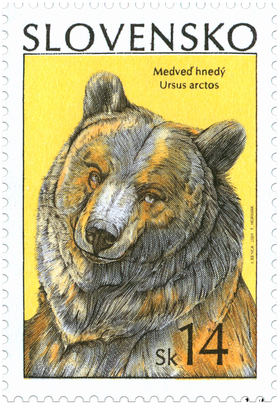 Medveď hnedý (Ursus arctos L.) Najväčší európsky mäsožravec. Pôvodne osídľoval takmer celú Európu, severnú a strednú Áziu, v Severnej Amerike vytvára viacero poddruhov. V súčasnosti sa v Európe súvislejšie vyskytuje len v Škandinávii a na východe kontinentu, izolované populácie sú v Pyrenejach, v Abruzách, na Balkáne a v Karpatoch. Na našom území žije v lesných komplexoch stredného a severného Slovenska v nadmorských výškach 700 - 1500 m. Robustné telo je dlhé 150 - 220 cm, výška v kohútiku 90 - 125 cm, hmotnosť 150 - 350 kg. Sfarbenie dlhej srsti je premenlivé, bledohnedé až čiernohnedé, medvieďatá majú svetlý hrdelný pás. Medve...