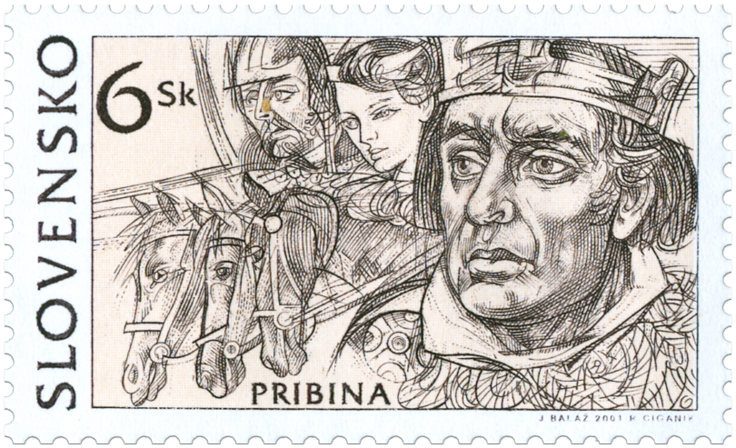 Osobnosti Veľkej Moravy - emisia v hárčekovej úprave. Na štyroch známkach, ktoré sú situované v dolnej častí hárčeka sú zobrazené portréty významných vládcov Vel'kej Moravy (začiatok 9. stor. - 906) - Pribinu, Rastislava, Koceľa, Svätopluka. Títo vládcovia Veľkej Moravy, pochádzajúci z Mojmírovskej kniežacej dynastie (833-906), sa pričinili o vznik, územný rozmach a kultúrny rozkvet prvého štátu západných Slovanov a sú zobrazení spolu s mapou Veľkej Moravy z čias jej najväčšieho rozkvetu. Mapa podľa spracovania akademika Jána Dekana je doplnená o reprodukciu archeologického nálezu - terčík so sokoliarom. Pribina ( okolo roku 800 - 861 ) - do roku 833 knieža nitrianske...