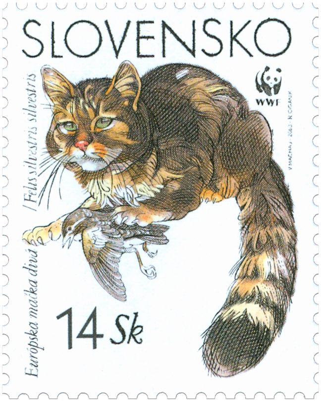 V emisnom rade Ochrana prírody koordinovanom v spolupráci so svetovým fondom na ochranu prírody WWF (World Wide Found For Nature) vychádzajú v hárčekovej úprave 4 príležitostné známky série Európska mačka divá (Felis silvestris silvestris). Známky sú označené logom WWF, na ktorom je panda veľká, a prezentovaná emisia sa tak zaraďuje do svetového filatelistického programu kolekcie známok zobrazujúcich ohrozené živočíšne druhy, ku ktorým patrí aj európska mačka divá. Európsky druh mačky divej bol už v mnohých oblastiach Európy vyhubený a dnes sa vyskytuje len v Škótsku, Nemecku a na Slovensku v hustých lesoch s bohatým podrastom. Toto divé a krásne zviera je...