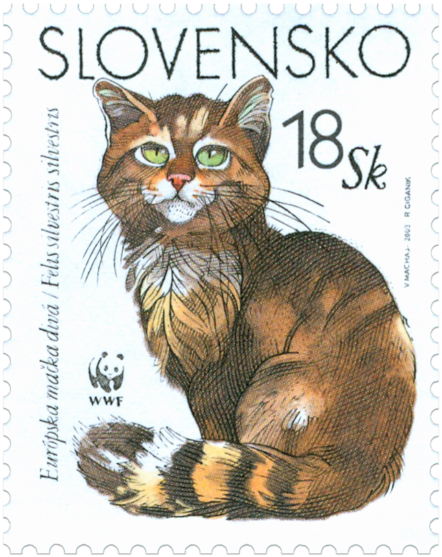 V emisnom rade Ochrana prírody koordinovanom v spolupráci so svetovým fondom na ochranu prírody WWF (World Wide Found For Nature) vychádzajú v hárčekovej úprave 4 príležitostné známky série Európska mačka divá (Felis silvestris silvestris). Známky sú označené logom WWF, na ktorom je panda veľká, a prezentovaná emisia sa tak zaraďuje do svetového filatelistického programu kolekcie známok zobrazujúcich ohrozené živočíšne druhy, ku ktorým patrí aj európska mačka divá. Európsky druh mačky divej bol už v mnohých oblastiach Európy vyhubený a dnes sa vyskytuje len v Škótsku, Nemecku a na Slovensku v hustých lesoch s bohatým podrastom. Toto divé a krásne zviera je...