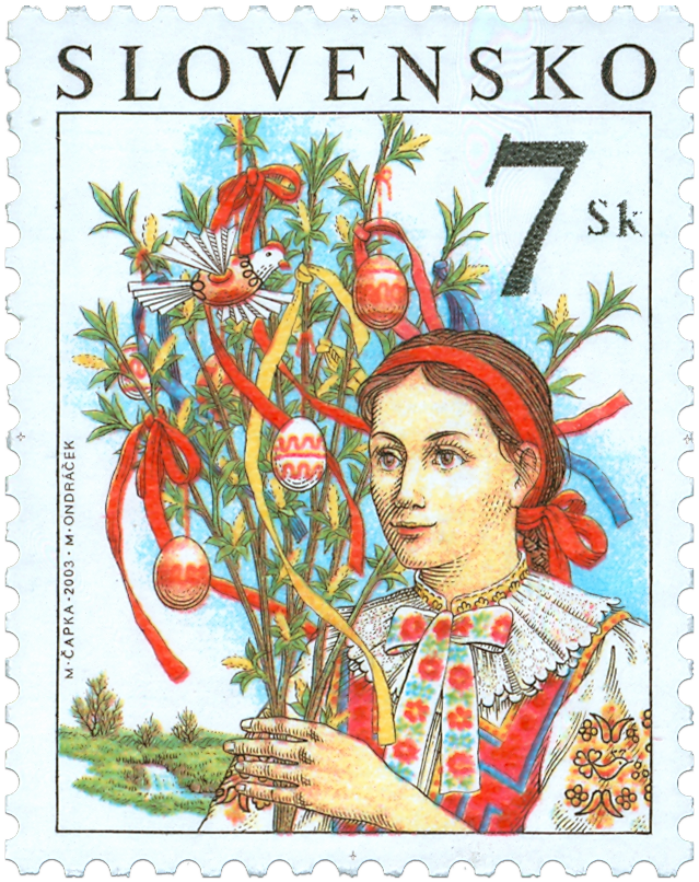 S týždňom pred Veľkou nocou sa na Slovensku i v prvej polovici 20. storočia spájajú zvyky siahajúce až do predkresťanského obdobia. Bohatá na obrady spojené s vítaním jari bola vždy najmä Kvetná nedeľa so symbolickým vynášaním zimy a donášaním leta. Na západnom Slovensku na Kvetnú nedeľu nosili dievčatá a deti so spevom a vinšami po dedine ozdobené zelené ratolesti pomenované „lesola“, „leto“ alebo „májik“, symbolizujúce nový rozkvet prírody na jar. Tento zvyk patrí do jarného zvykoslovného cyklu. Na známke je dievča vo vajnorskom kroji v ruke s lesolou – zelenou ratolesťou ozdobenou kraslicami a farebnými stuhami. Zdobená bývala i papierovými a...