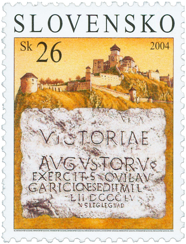Latinský text rímskeho nápisu v Trenčíne: VICTORIAE AVGVSTORV(m) EXERCITVS QVI LAV GARICIONE SEDIT MIL(ites) ...L(egionis) II DCCCLV (Marcus Valerius) MAXIMIANVS LEG(atus) LEG(ionis) II AD(iutricis) CVR(avit) F(aciendum) V preklade: Víťazstvu cisárov a vojska, ktoré sídlilo v Laugariciu v počte 855 vojakov II. légie, dal zhotoviť M. V. Maximianus, legát II. pomocnej légie. Monumentálny latinský nápis na hradnej skale z r. 179 po Kr. je jedinečná pamiatka svojho druhu in situ na našom území. Ním zvečnili vojská za vlády Marca Aurelia a jeho syna Commoda svoje víťazstvo počas markomanských vojen nad germánskymi Kvádmi v Laugariciu (na území Trenčína). Osada Leukaristos sa dostala v...