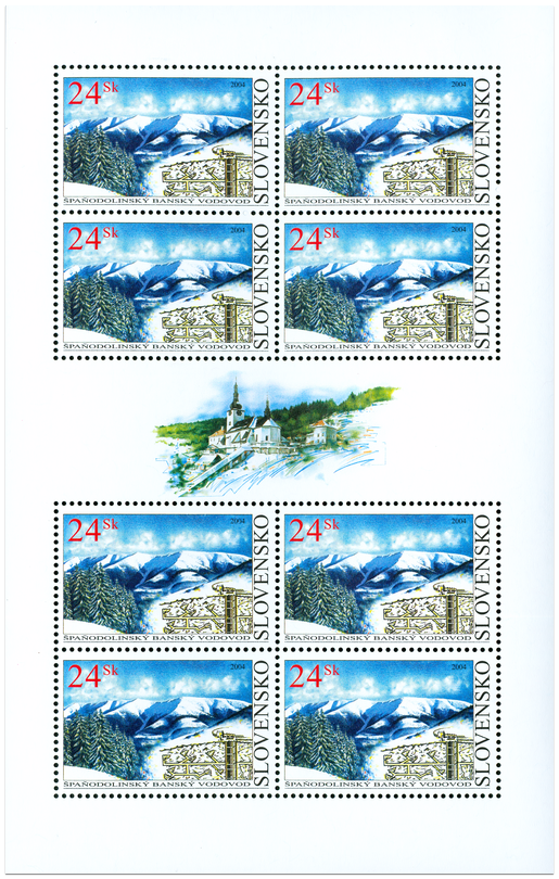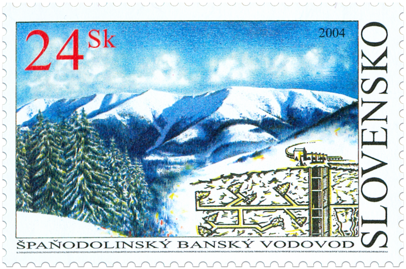 Špaňodolinský banský vodovod patrí medzi najvýznamnejšie technické diela z histórie baníctva na Slovensku. Bol to povrchový vodný náhon, ktorý v drevených žľaboch a zemných jarkoch privádzal vodu na pohon ťažných strojov a iných zariadení v baniach na meď a striebro v Španej Doline a jej okolí. Vznikal po etapách a bol funkčný od začiatku 16. storočia až do začiatku 20. storočia. Zachytával vodu z prameňov pri Donovaloch a neskôr až pod Prašivou v Nízkych Tatrách. Hlavný prívod vodovodu mal dĺžku 27 km, celý vodovodný systém so záchytami a rozvádzacími jarkami meral až 42 km. Na známke je pohľad na masív Prašivej...