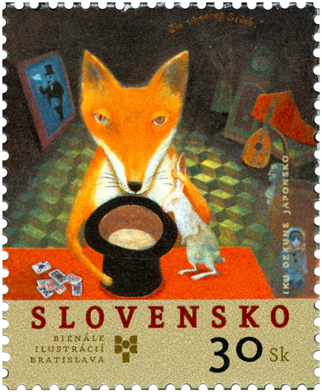© Slovenská pošta, a..s., 2005 Bienále ilustrácií Bratislava (BIB) je medzinárodná súťažná výstava originálov ilustrácií detských kníh. Dielo reprodukované na známke je knižná ilustrácia, ktorú medzinárodná porota ocenila na BIB 2003. Na tomto bienále sa celkovo predstavilo 311 ilustrátorov z 38 krajín, pričom Grand Prix BIB 2003 získala Iku Dekune z Japonska. Jej ilustrácia však neprezentuje typické znaky japonskej ilustračnej kultúry. Ilustrácie tejto umelkyne nesú znaky európskej ilustrácie a autorka nezaprie ani skutočnosť, že bola žiačkou profesora Dušana Kállaya. Kállayov vplyv na jej tvorbu je evidentný v chápaní ilustrácie, v poetike, vo fantazijných polohách a vo vyprofilovanom zmysle pre jemný, nenápadný...