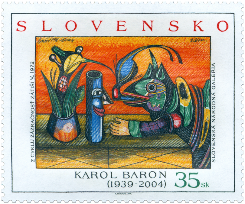 © Slovenská pošta, a.s., 2005 Karol Baron patrí k významným slovenským maliarom druhej polovice 20. storočia a ako jediný sa orientoval na surrealizmus. Študoval na Vysokej škole výtvarných umení v Bratislave u prof. Petra Matejku monumentálnu maľbu. Od začiatku 70. rokov, po úspešných prvých výstavách, sa jeho umelecký názor stal neprijateľným. Zapojil sa do undergroundového hnutia českých a slovenských surrealistov. Pre nemožnosť vystavovať voľnú tvorbu sa venoval tvorbe gobelínov pre rôzne reprezentačné miestnosti. Rozsiahle maliarske dielo mohol zverejniť až na konci 80. rokov. Odvtedy sa dostal do popredia pozornosti, usporiadal si množstvo výstav doma i v zahraničí. Pedagogicky pôsobil na Univerzite...