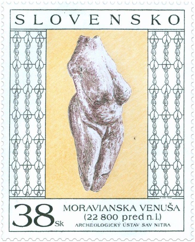 © Slovenská pošta, a .s., 2006 Najstaršie doklady umeleckého prejavu z územia Slovenska pochádzajú z obdobia mladšieho úseku staršej doby kamennej – paleolitu. Zastúpené sú najmä drobné predmety ako amulety, závesky a koráliky. Predstavujú samostatný druh umelecko-úžitkových predmetov. Výnimočným výtvarným prejavom je nález sošky ženy so zvýraznením pohlavných znakov. Moraviansku venušu z mamutoviny vyrezal okolo roku 22 800 pred n. l., na základe datovania C14, človek dnešného typu. Na úkor iných častí tela sa snažil, aby vynikli symboly predstavujúce zachovanie ľudského rodu. Žena, ako symbol darkyne života, mala v tomto období významné postavenie v spoločnosti. A práve zvýraznenie ženských atribútov sa...